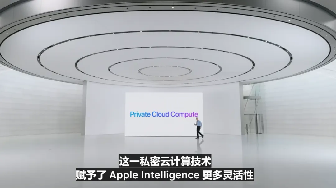 大多数这类模型都能在完全的端侧运行,有时用到的模型大到无法放在随身携带的设备,这时候服务器就可以产发挥作用了。传统的服务器会储存你的数据,但苹果创造了Private Cloud Compute——私密云计算技术,私密云计算技术让智能系统能够扩展引入更大的基于服务器的模型,来处理更复杂的需求,同时妥善保护数字隐私安全。