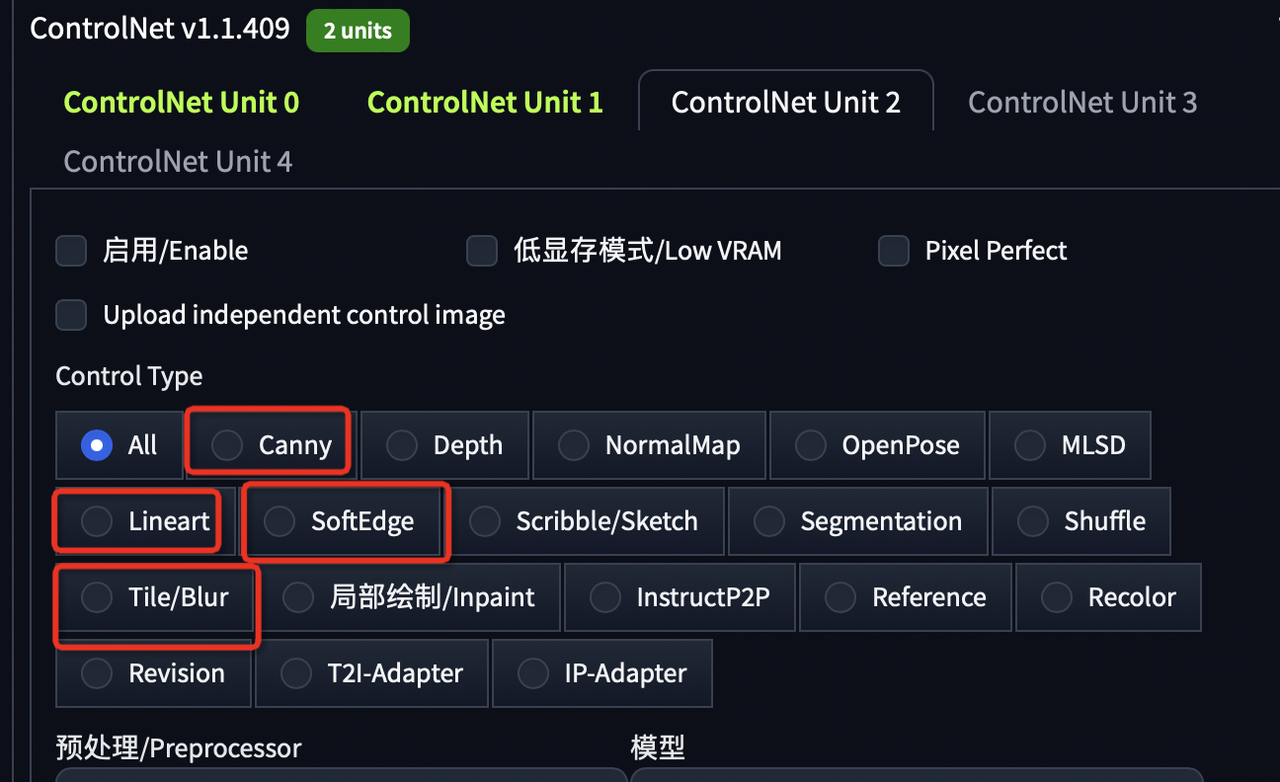 ControlNet的使用 这里的ControlNet 一般会两两搭配。这里讲两个窍门如果你想让转绘的画面和之前看起来人物整体保持一致就使用tile,如果想让AI更有创造力那就考虑使用canny、Lineart或者softedge都是可以的。这里我一般使用tile+lineart一起使用,如果你的画面存在一定的景深则需要使用depth。
