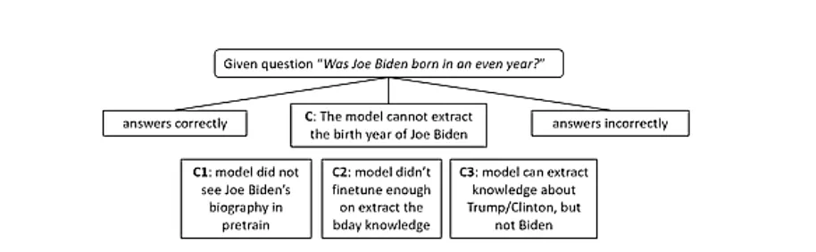 相比于在一个模型上进行测试,看看它的表现有多准确,我更加主张,先研究一系列前提——模型的失败,是否可能是因为模型无法提取名人的出生年份?或者是否是因为模型在预训练数据中没有看过 Joe Biden 的传记?再或,即使模型学习过这样的传记,是否是因为模型无法提取名人的生日信息?或者可能是模型能够提取某些名人的生日信息,但无法提取其他另外名人的生日信息。