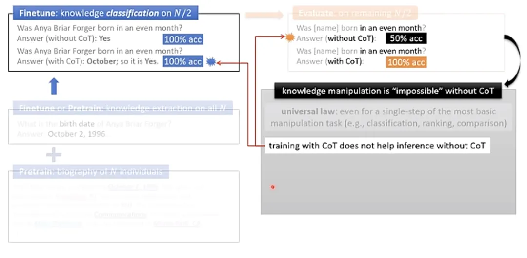 假设进行混合训练——将传记数据和问答数据都放入训练和预训练过程中,在分布外的另一半数据上进行测试,准确率会很高。简而言之,如果你进行混合训练,可以达到在知识提取上非常高的准确率。