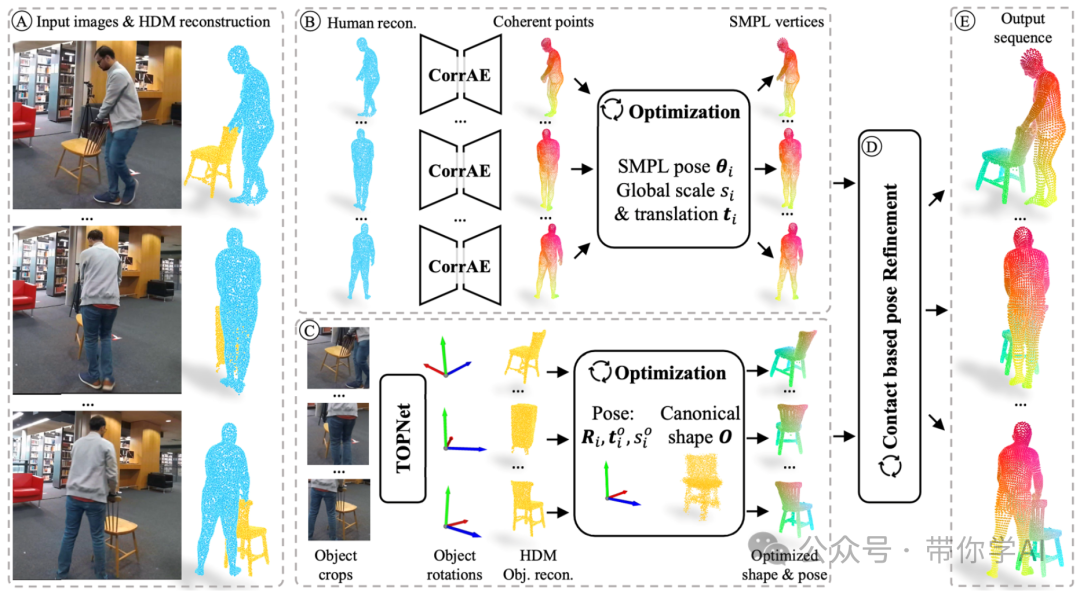 主要思想是将 4D 跟踪问题分解为全局形状优化和每帧姿势跟踪,从而大大减少了解决方案空间。对于人类,使用简单但高效的自动编码器 CorrAE 来获取连贯的人类点,并通过 SMPL 层优化人类。对于物体,使用时间物体姿势估计器 TOPNet 来预测物体旋转,这能够在规范空间中优化常见的物体形状并微调姿势预测。然后,根据接触点联合优化人类和物体以获得一致的跟踪。