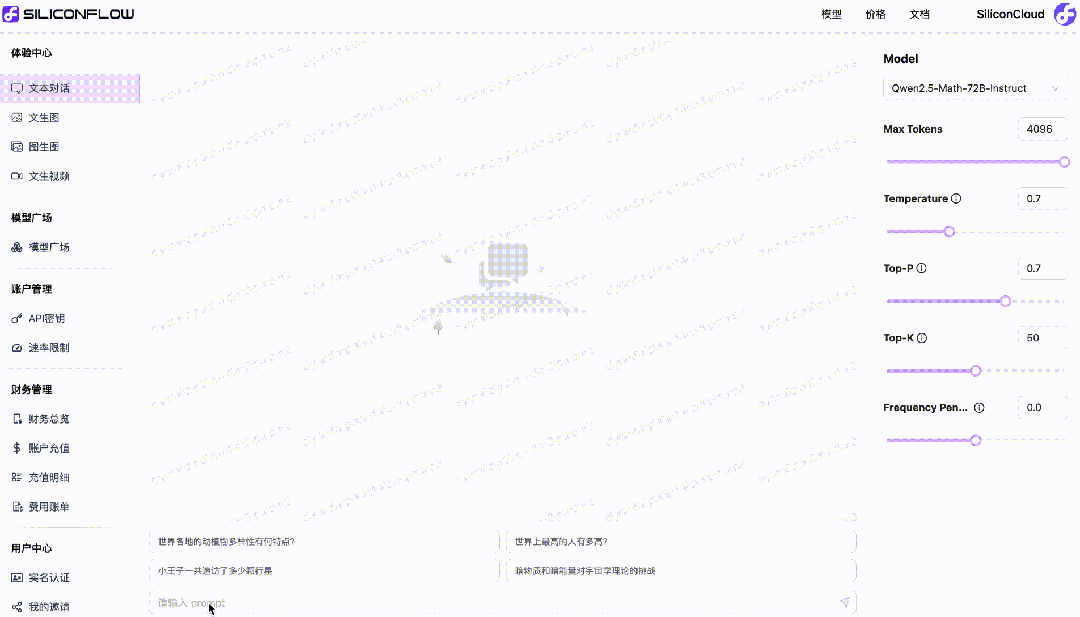 除了Qwen2.5-Coder-7B-Instruct、Qwen2.5-Math-72B-Instruct,SiliconCloud已上架包括Qwen2.5-7B/14B/32B/72B、Flux.1、DeepSeek-V2.5、InternLM2.5-20B-Chat、BCE、BGE、SenseVoice-Small、Llama-3.1、DeepSeek-Coder-V2、SD3 Medium、GLM-4-9B-Chat、InstantID在内的多种开源大语言模型、图片生成模型、代码生成模型、向量与重排序模型以及多模态大模型。