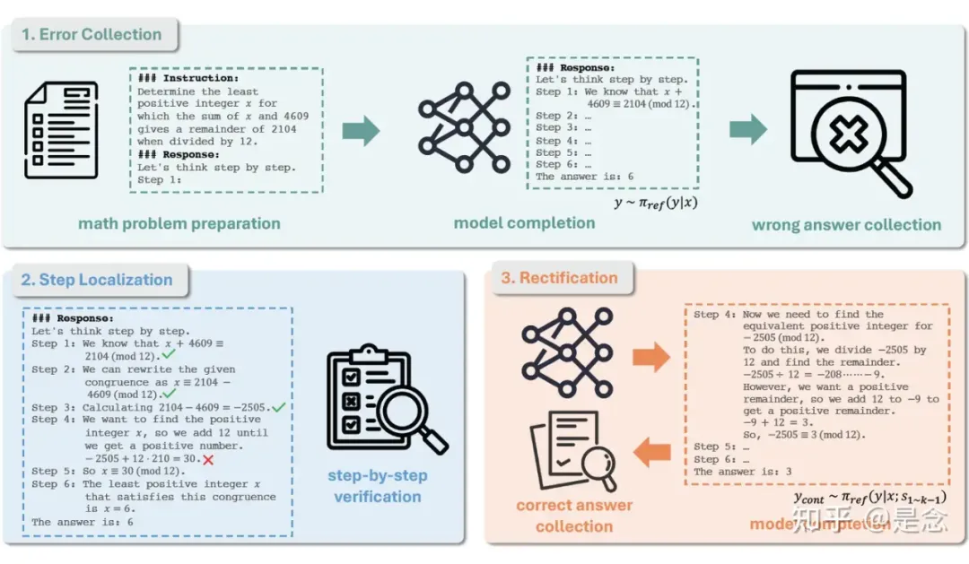 1. Error collection:使用了 COT 的推理 prompt,例如 ‘Let’s think step by step. Step 1:’,这确保模型的推理结果被结构化为多个推理步骤,每个步骤都明确以 “Step i:” 开头。
