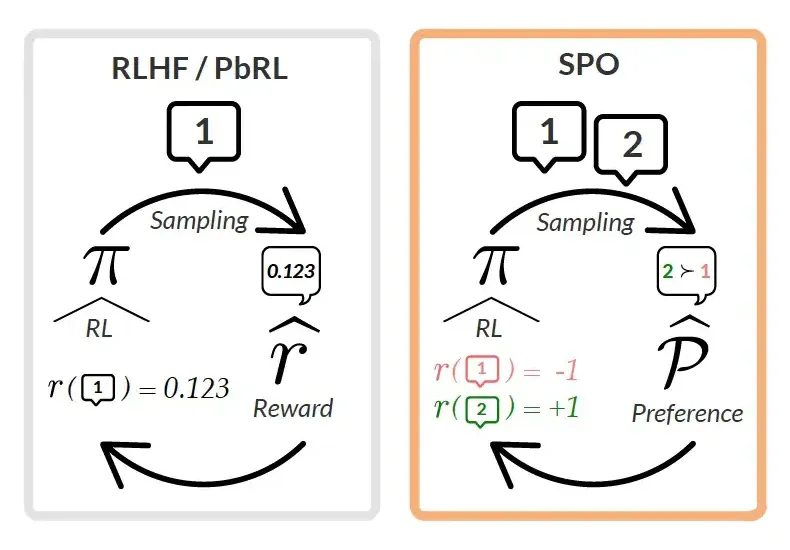 如下图,基于偏好的 RL / RLHF 的标准流程(左)涉及基于成对偏好数据集训练奖励模型(即分类器),然后通过 RL 对其进行优化。引入了 SPO(右),这种方法直接基于偏好或教师模型提供的偏好反馈进行优化,每个轨迹都会根据其偏好的其他 onpolicy 轨迹的比例获得奖励。我们通过经验证明和验证,这种方法比以前的研究对非传递、非马尔可夫和嘈杂偏好更具鲁棒性。