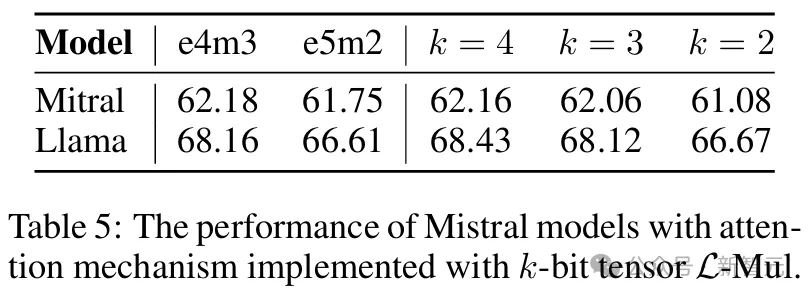 红色表示平均误差低于fp8_e4m3,下划线表示误差介于e4m3和e5m2之间以上两个模型的平均误差如图4所示。前面的理论推导显示,L-Mul在使用的计算资源少于fp8_e5m2时,期望误差可以低于fp8_e4m3,此处的实验结果正式了前面理论估计的正确性。实验表明,在各种规模的LLM中,使用6位尾数FP操作数的L-Mul算法近似达到最低平均误差,显著优于e5m2、e4m3两种fp8格式。此外,3位和4位尾数的L-Mul分别达到或超过了fp8_e5m2和fp8_e4m3的精度。