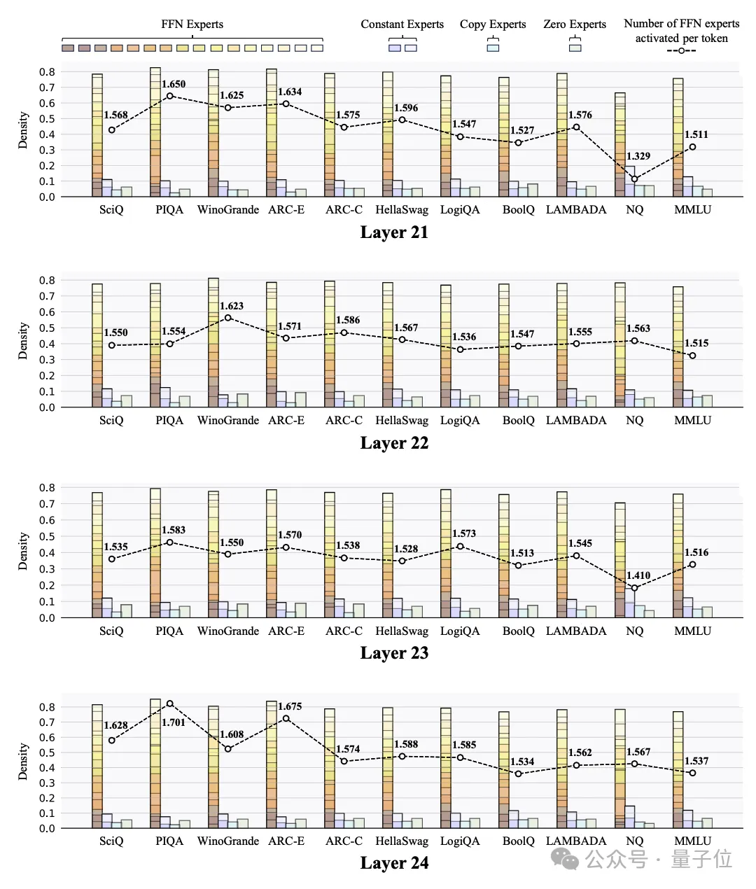 △图3:在MoE++中不同Token所需要的平均FFN专家数量