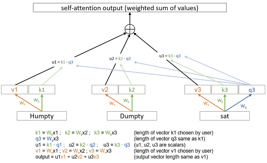 对于那些不是第一次阅读自注意力机制的人来说,可能会注意到我们没有引用任何K和Q矩阵,或应用掩码等。这是因为这些细节是实现方式的一部分,源于这些模型的常见训练方式。一批数据被输入,模型同时训练以从“humpty”预测“dumpty”,从“humpty dumpty”预测“sat”,等等。这是为了提高效率,并不影响解释或模型输出,我们选择在这里省略这些训练效率的技巧。