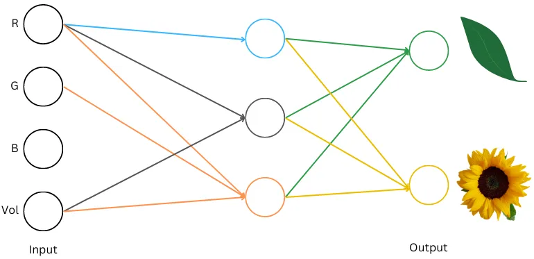 模型并不知道什么是叶子或花,或(RGB,Vol)是什么。它的任务是接收确切的4个数字并输出确切的2个数字。我们将这4个输入数字解释为(RGB,Vol),同时查看输出数字并推断如果第一个数字更大则为叶子,反之则为花。当然,我们需要选择合适的连边权重,以便模型能够接收我们的输入数字并给出正确的两个数字,使得我们解释时能得到想要的结果。