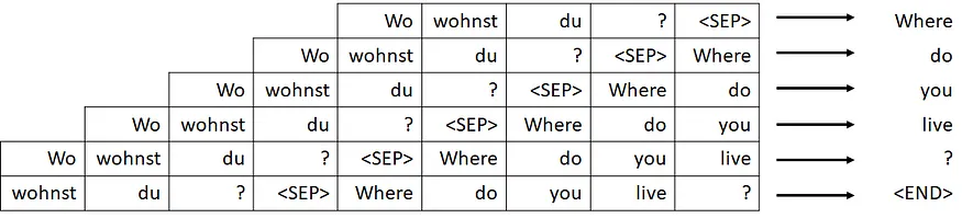 如果你查看GPT的架构,你会发现它非常擅长生成序列中的下一个单词。它从根本上遵循了我们第一部分讨论的相同逻辑。从几个单词开始,然后一次生成一个。但是,如果你想进行翻译呢。如果你有一个德语句子(例如“Wo wohnst du?” = “Where do you live?”),并且你想将其翻译成英语。我们又该如何训练模型?
