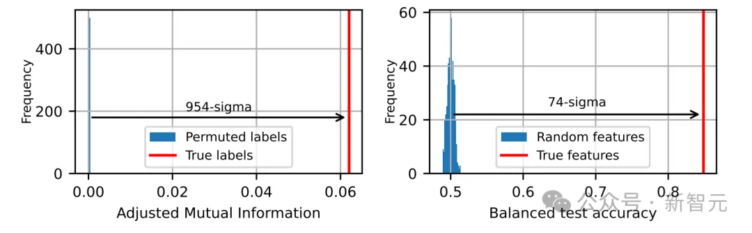 为了量化其统计显著性,研究者使用了两种方法来排除原假设:1. 虽然可以基于特征是否同时出现进行聚类,但也可以基于SAE特征解码向量的余弦相似度来进行谱聚类。他们首先使用了余弦相似度对SAE特征进行聚类,然后使用共现对特征进行聚类,之后计算这两组标签之间的相互信息。在某种意义上,这直接衡量了通过了解功能结构可以获得多少关于几何结构的信息。2. 另一个方法就是训练模型,通过几何信息预测特征所属的功能脑叶。为此,研究者将基于共现聚类得到的脑叶标签集作为目标,使用逻辑回归模型直接根据点的位置预测这些标签,并使用80-20的训练-测试集划分,报告该分类器的平衡测试准确率。