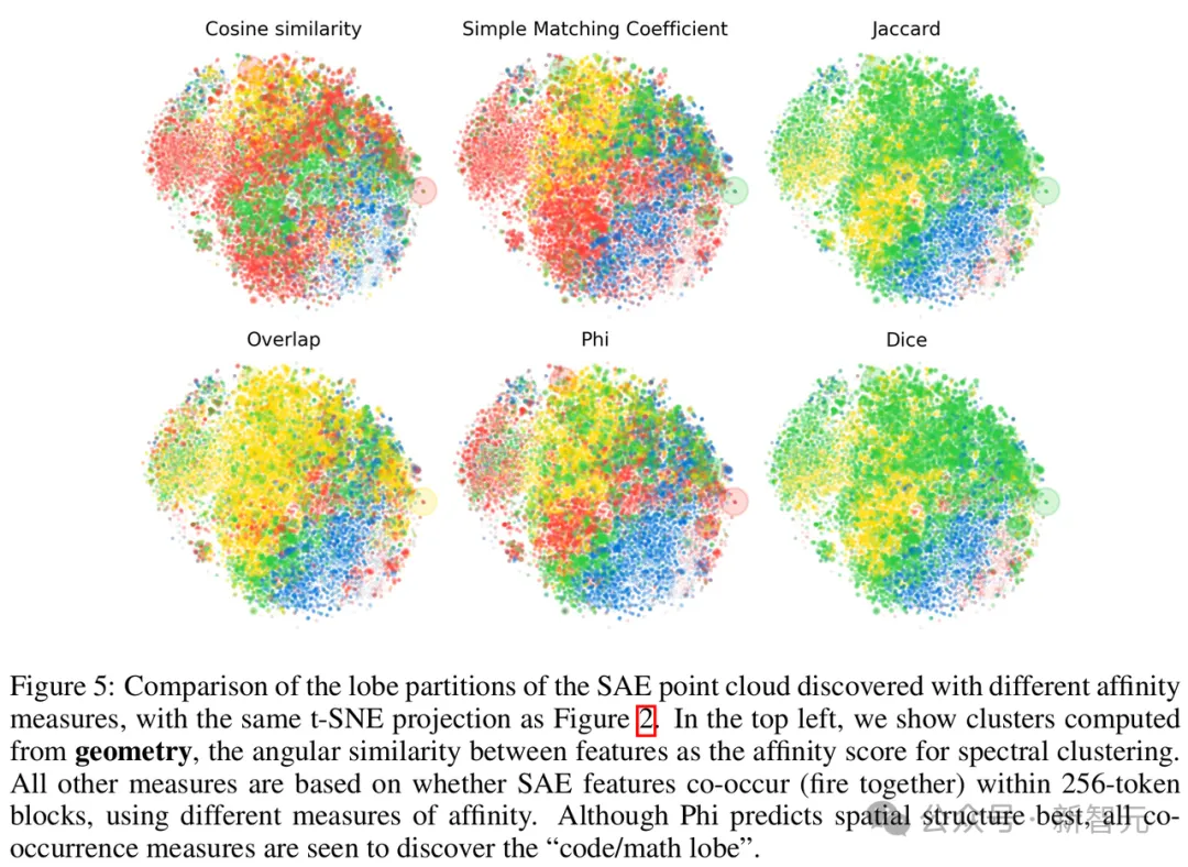 研究者非常好奇,是否可以在SAE特征空间中找到类似的功能模块呢?他们测试了多种方法,来自动发现这类功能性「脑叶」,并量化它们是否是空间模块化的。他们将脑叶分区定义为点云的一个k子集的划分,这种分区的计算不使用位置信息,相反,他们是基于它们在功能上的关联性来识别这些脑叶分区的。具体来说,这些脑叶在同一文档内倾向于一起激活。为了自动识别功能脑叶,研究者首先计算了SAE特征共现的直方图。他们使用Gemma2 2B模型处理了来自The Pile的文档。研究者发现,在第12层的残差流SAE具有16k个特征,平均L0为41。他们记录了这个SAE被激活的特征(如果某特征的隐藏激活值> 1,则将其视为被激活)。如果两个特征在同一个256个token的块内同时激活,则它们被视为共现。此长度提供了一种粗略的「时间分辨率」,使他们能够发现倾向于在同一文档中共同激活的token,而不仅限于同一token。研究者使用了最大长度为1024的上下文,并且每个文档只使用一个这样的上下文,这就使他们在The Pile的每个文档中最多有4个块(和直方图更新)。他们在5万个文档中计算了直方图。基于此直方图,他们根据SAE特征的共现统计,计算了每对特征之间的亲和分数,并对得到的亲和矩阵进行了谱聚类。研究者尝试了以下基于共现的亲和度计算方法:简单匹配系数、Jaccard相似度、Dice系数、重叠系数和Phi系数,这些都可以仅通过共现直方图计算得出。