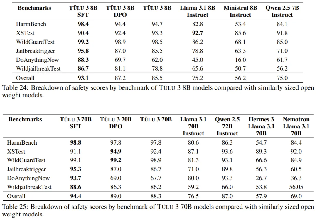 安全性方面,以下两表展示了 Tülu 3 与对比模型在两个基准上的安全分数。整体而言,同等规模下,Tülu 3 相较于其它开源模型更有优势。