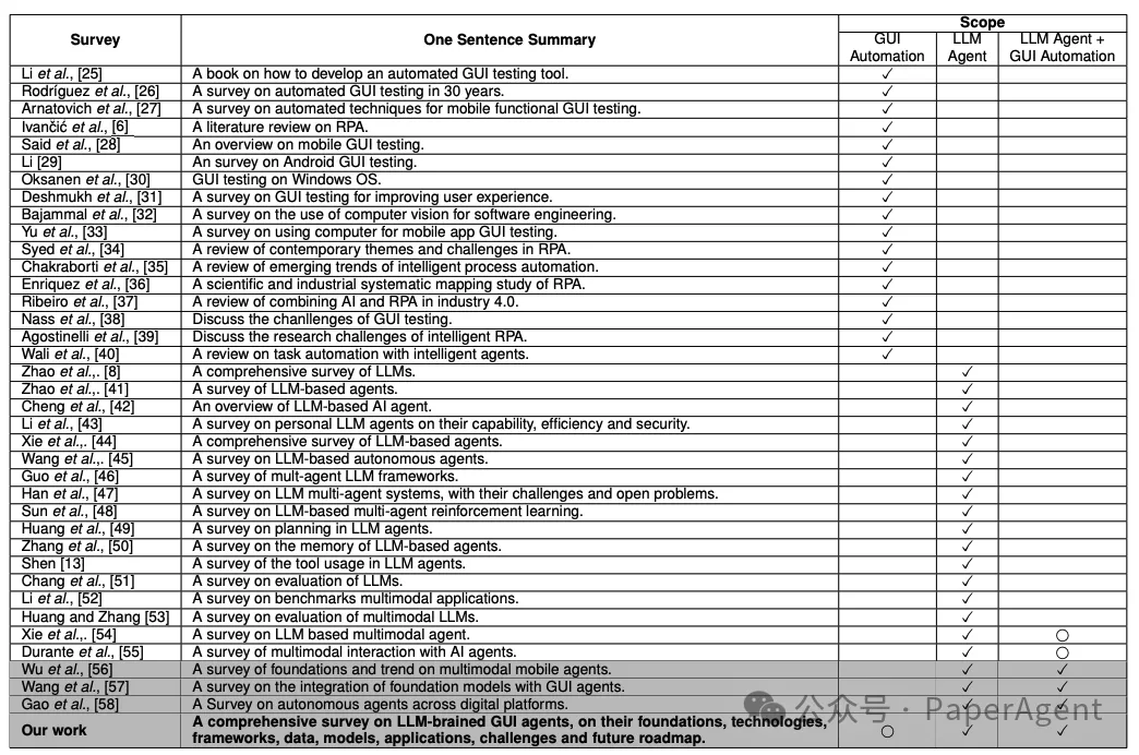 关于GUI自动化和LLM智能体的代表性调查和书籍的总结。一个✓符号表示出版物明确涉及给定领域,而一个⃝符号表示出版物不专注于该领域但提供了相关见解。同时涵盖GUI自动化和LLM智能体的出版物被突出显示以强调。