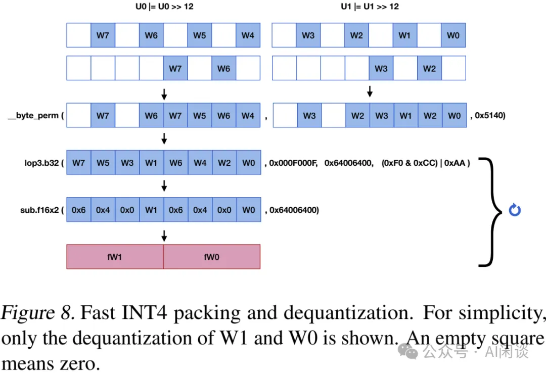 随后,使用 CUDA Math API __byte_perm 从这两个整数中选择目标位。通过这种方式,可以方便的按顺序打包 8 个 4 位整数进行反量化。