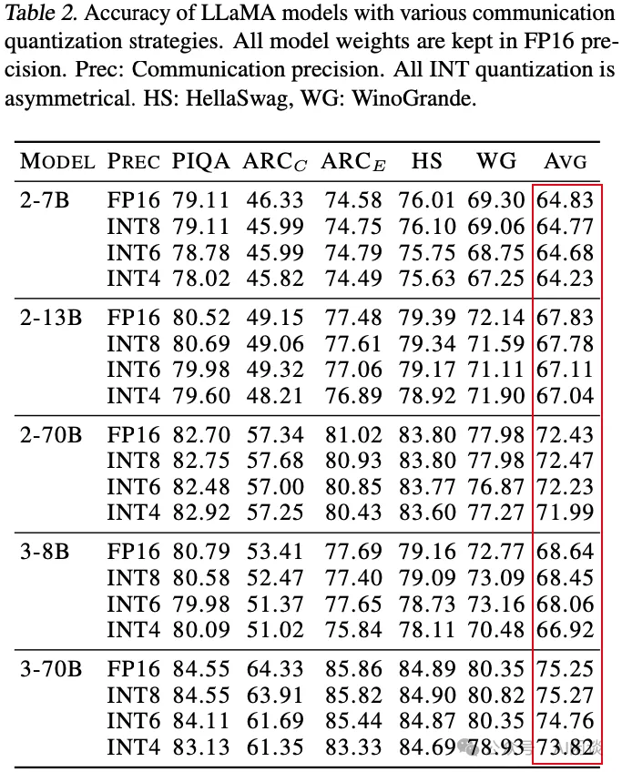 INT6 量化:鉴于在 All-Gather 之前进行低比特量化会导致更大的损失,这里作者选择采用 INT8 位宽,同时保持 ReduceSum 的 INT4 位宽,从而有效构建了一个 INT6 解决方案。INT6 配置在性能与通信效率之间达到了很好的平衡。