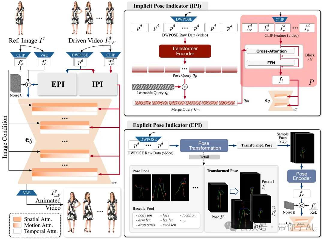首先,从一张参考图像中提取特征,包括通过 CLIP 提取的图像特征和通过 VAE 提取的潜在特征。此外,提出了两种特征生成方式:隐式姿态指示器(IPI)和显式姿态指示器(EPI),分别生成运动特征和姿态特征。
