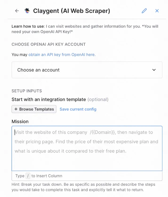 1. 检索并获取数据:Claygent 集成了 Google Search, ChatGPT 和 web scraping,用户只需在 Mission 栏内输入对应的 prompts,即可一键自动完成 ICP 信息检索。此外,用户还可以选择使用自己的 OpenAI API Key 或者是 Clay 的 OpenAI API Key 来完成检索,前者免费,后者则需要单次消耗 1 积分。