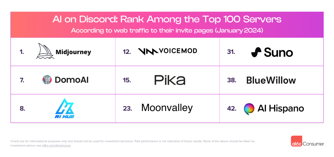 一些现在主要的消费者AI产品,像Suno一样,最初是在Discord服务器上开始的,或者仍然主要通过Discord运行。这个平台提供了一个测试场地以及社区,而不需要进行完整的前端产品构建。真正的Discord服务器流量几乎不可能测量,但每个服务器邀请页面的网络流量是一个近似指标。根据这一指标,截至2024年1月,有九个AI产品或社区在按邀请流量排名的前100个Discord服务器中,其中Midjourney排名第一。