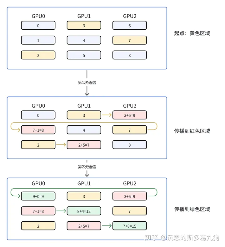 - 流程拆分:拆成两步:reduce-scatter和all-gather。
