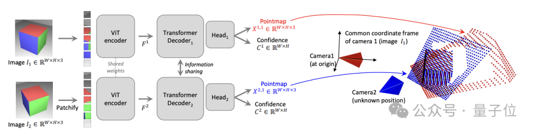 具体网络架构方面,DUSt3R基于的是标准Transformer编码器和解码器,受到了CroCo(通过跨视图完成3D视觉任务的自我监督预训练的一个研究)的启发,并采用简单的回归损失训练完成。