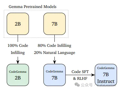 CodeGemma是谷歌开源的编程大模型,它是用Gemma系列模型继续在代码数据集上训练得到的。Google共开源了3个版本的CodeGemma模型,分别是CodeGemma-7B、CodeGemma-7B-IT以及CodeGemma-2B。三者的关系如下: