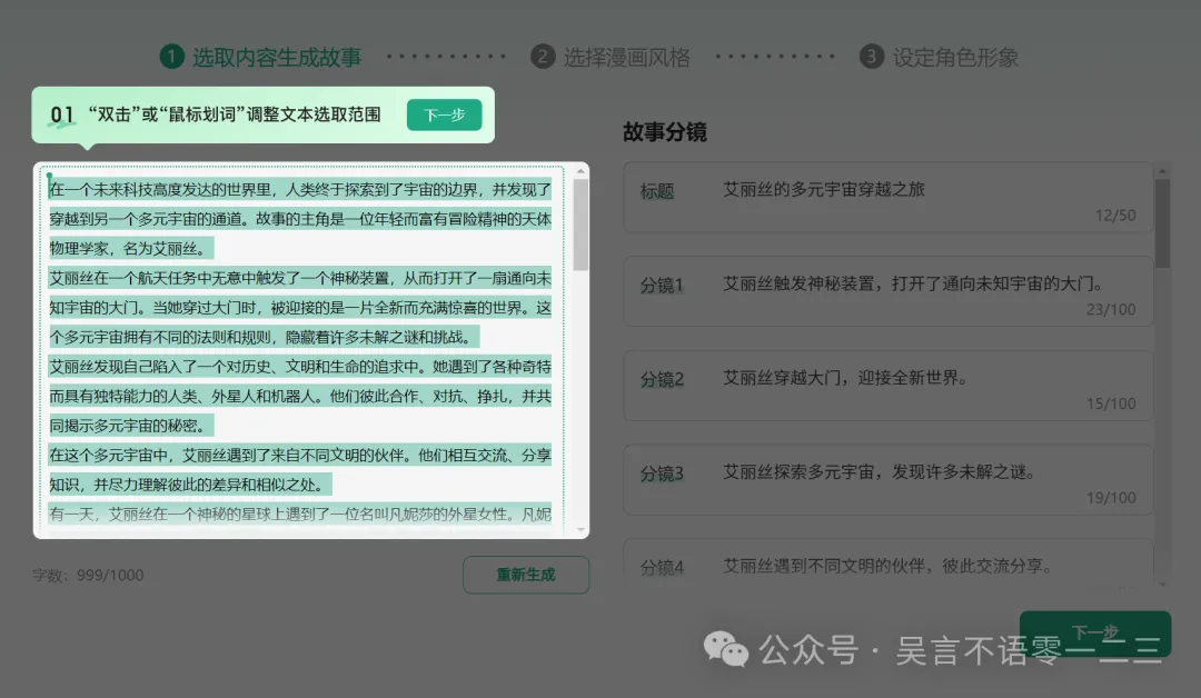 5.然后我们进入到了生成步骤页,文档中的内容可以选取最多1000字,然后根据这个生成右边的标题和分镜头脚本,右边的内容也可以自己调整,根据1000字的文字限制,分镜生成后大约在10-15个左右,也就是最大目前支持生成15幅漫画,不过平台这个限制后续或许就优化好了。