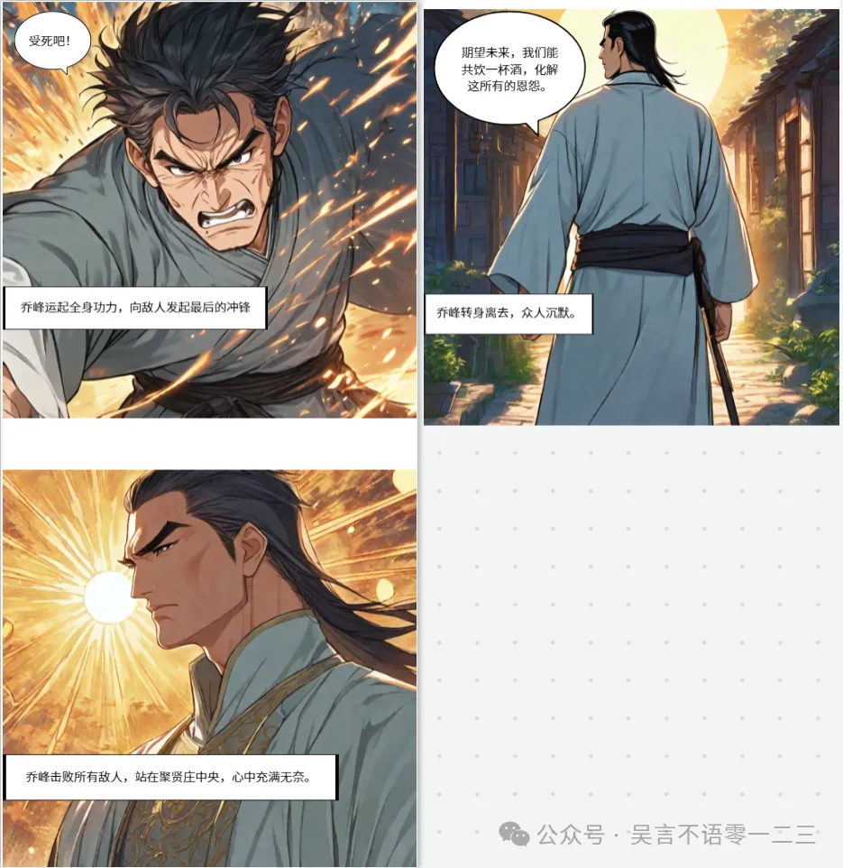 14.除了刚才说的上传文档方式,也可以直接选择“输入主题生成漫画”,也就是说,你告诉AI你要写的故事主题,上限400字,AI就会帮你细化情节。比如我试了下《天龙八部》里面一个精彩章节的主题:前丐帮帮主乔峰在聚贤庄大战中原各门派武林高手。